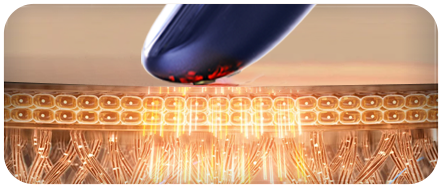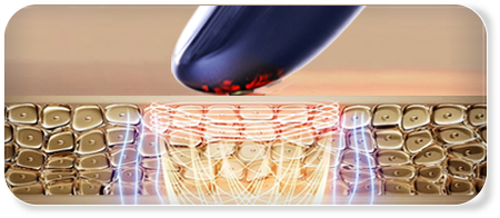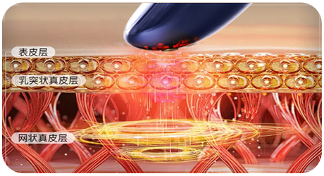 通過(guò)RF(射頻)、EMS(肌電刺激)、EP(電穿孔)和LED來(lái)震動(dòng)、穿透和修護(hù)皮膚的真皮組織,達(dá)到提拉緊致、刺激膠原再生等抗老效果。